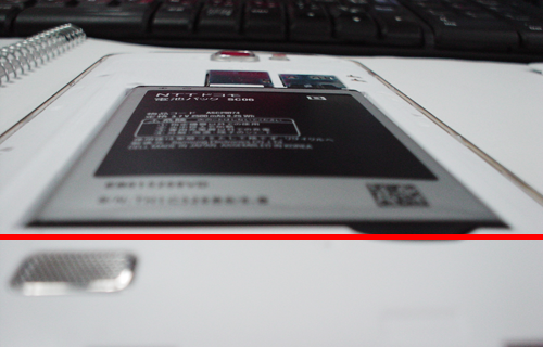 同じように赤い線の上をご覧ください。こちらもピントが合ってませんが、電池パックが若干ハミ出てるのが分かると思います。
